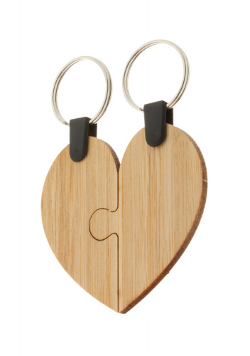 OPIS: Breloki tworzące kształt serca ze sklejki bambusowej z metalowymi kółkami.
