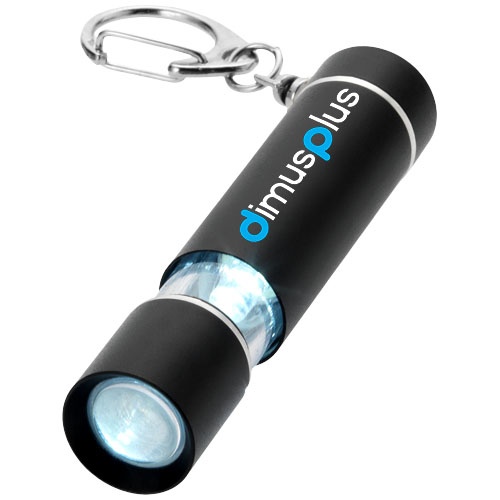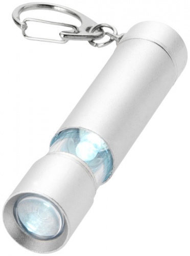 OPIS: Brelok z latarką Lepus. Pojedyncza biała dioda LED z funkcjami latarki i lampki. Włączana przyciskiem. Aby uzyskać więcej światła należy wyciągnąć korpus. Metalowe kółko do kluczy. Baterie w zestawie.