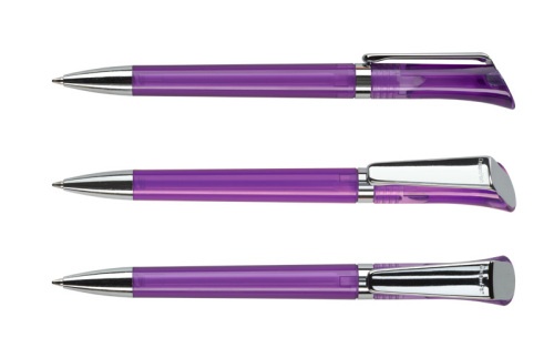 OPIS: długopis plastikowy z mechanizmem typu TWIST /przekręcanym/, korpus kolorowy transparentny , długopis posiada metalowe elementy /końcówkę, klips oraz ring/