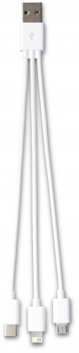 OPIS: Kabel 3-w-1 Tril w futerale. Kabel 3-w-1 z adapterem USB typu C oraz adapterem 2-w-1 do urządzeń z systemem Apple iOS i Android. Wszystkie adaptery umożliwiają tylko ładowanie urządzeń. W zestawie z przezroczystym futerałem. Długość kabla: 19 cm. Plastik ABS.