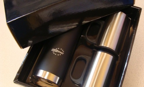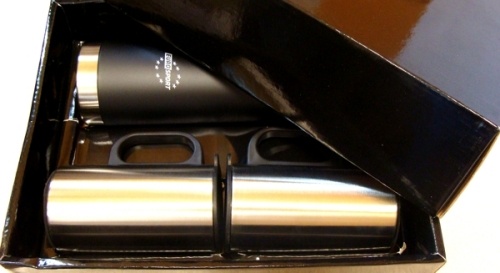 OPIS: termos ze stali nierdzewnej o pojemności 500ml z dwoma kubkami o pojemności 220 ml, pakowane w ozdobne, grube kartonowe pudełko /patrz zdjęcia w galerii/