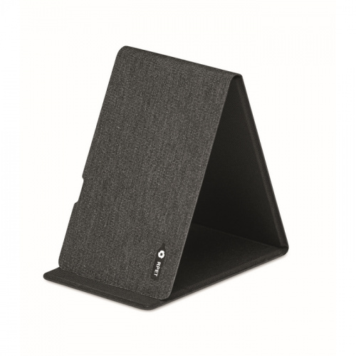 OPIS: Stojak na telefon 300D melanż, RPET i 10W z funkcją bezprzewodowego ładowania. Wyjście: 9V/1.1A (10W) do szybkiego ładowania. Kompatybilny z najnowszymi modelami Android, iPhone ® 8 i nowsze.
