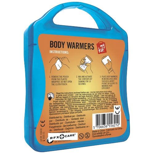 OPIS: Idealny zestaw, aby zatrzymać ciepło w okresie zimowym i podczas zimowych sportów. Zawartość: 4 body warmers,1 wkładka. Produkty z zestawu spełniają wszystkie obowiązujące przepisy UE. Cena obejmuje pełen nadruk. Plastik.