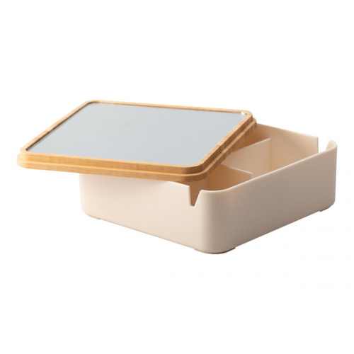 OPIS: Stylowe pudełko z bambusową pokrywą idealne do przechowywania biżuterii, kosmetyków lub innych drobiazgów. W bambusowej pokrywie ukryte jest duże lusterko.