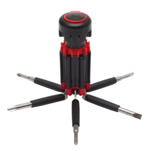 W skład zestawu wchodzą: 2 wkrętaki płaskie, 2 wkrętaki Philips (krzyżowe) i klucz Torx. Wkrętaki mają właściwości magnetyczne. Dodatkowo wyposażony w klip do zaczepienia. Zasilany 2 bateriami AAA dołączonymi do zestawu.