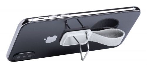 OPIS: Samoprzylepny uchwyt na telefon z metalu i tworzywa sztucznego, z paskiem poliestrowym.