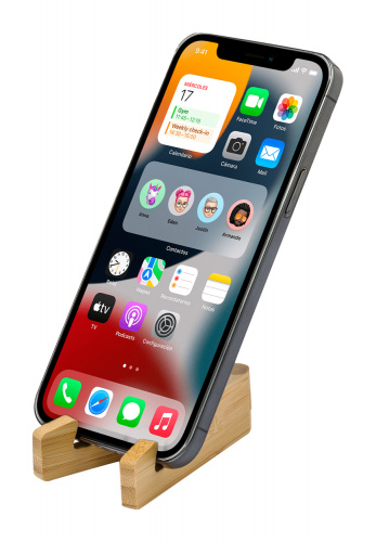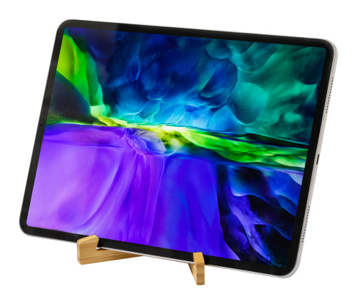 OPIS: Składany, bambusowy uchwyt na telefon komórkowy i tablet.