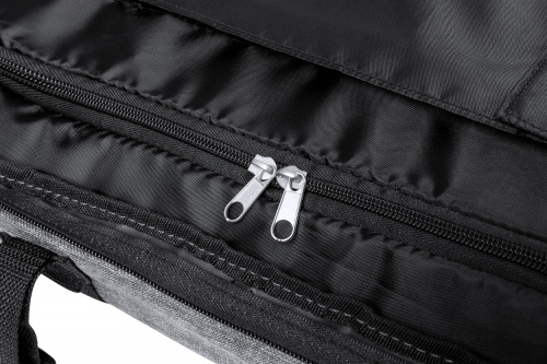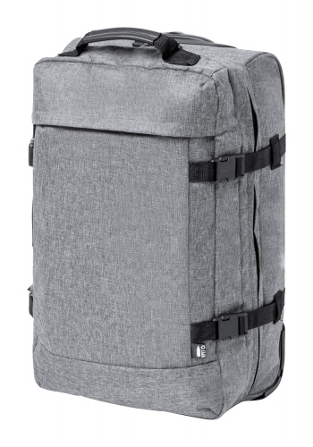 OPIS: Torba/walizka na kółkach RPET z 2 kółkami, teleskopową rączką i zamkiem szyfrowym TSA. Poliester 300D RPET z charakterystyczną metką RPET.