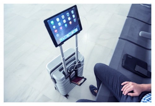 OPIS: Sztywna plastikowa walizka z 4 kółkami, teleskopową rączką, z uchwytem na tablet i zamkiem szyfrowym TSA. Z przegrodą na powerbank i gniazdem USB. Powerbank nie znajduje się w zestawie.