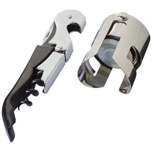 OPIS: Zestaw do wina i szampana Belgio. 2-elementowy zestaw upominkowy z korkociągiem do otwierania Twoich ulubionych win i szampanów oraz zatyczka do butelek, która pomoże zachować świeżość dobrej butelki niedokończonego szampana. Zapakowany w drewniane pudełko prezentowe z plakietką na logo. Drewno, stal nierdzewna oraz plastik ABS.